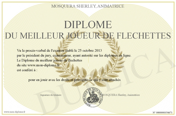 Envoyez par email votre Diplôme du meilleur joueur de flechettes personalisé