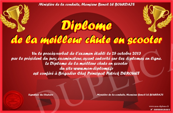 Envoyez par email votre Diplôme de la meilleur chute en scooter personalisé