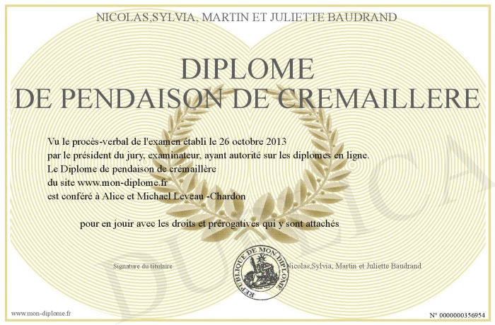 Envoyez par email votre Diplôme de pendaison de crémaillère personalisé