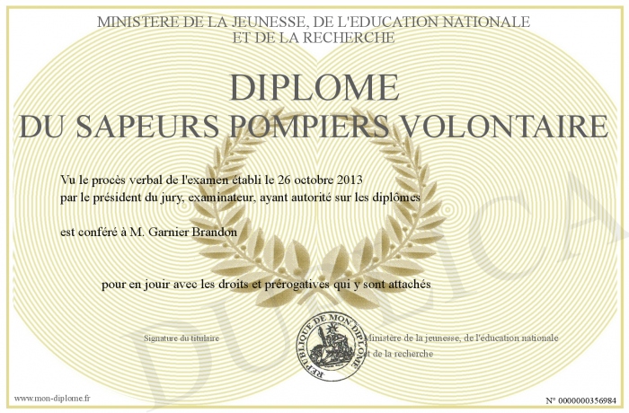 Envoyez par email votre Diplôme du sapeurs pompiers volontaire personalisé