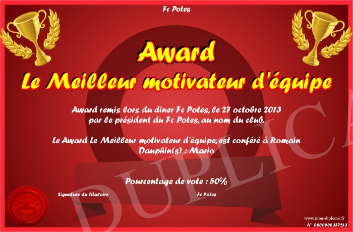 Envoyez par email votre Award Le Meilleur motivateur d'équipe personalisé