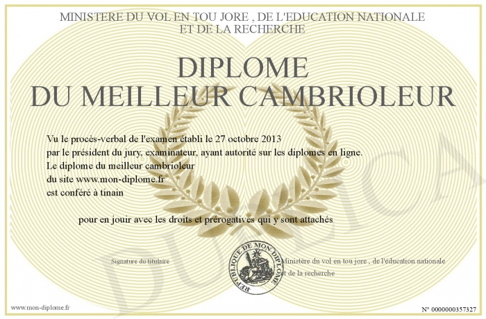 Envoyez par email votre diplome du meilleur cambrioleur personalisé