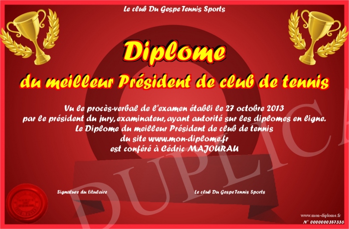 Envoyez par email votre Diplôme du meilleur Président de club de tennis personalisé