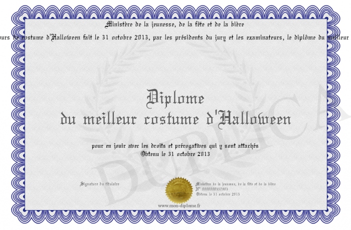 Envoyez par email votre Diplôme du meilleur costume d'Halloween personalisé