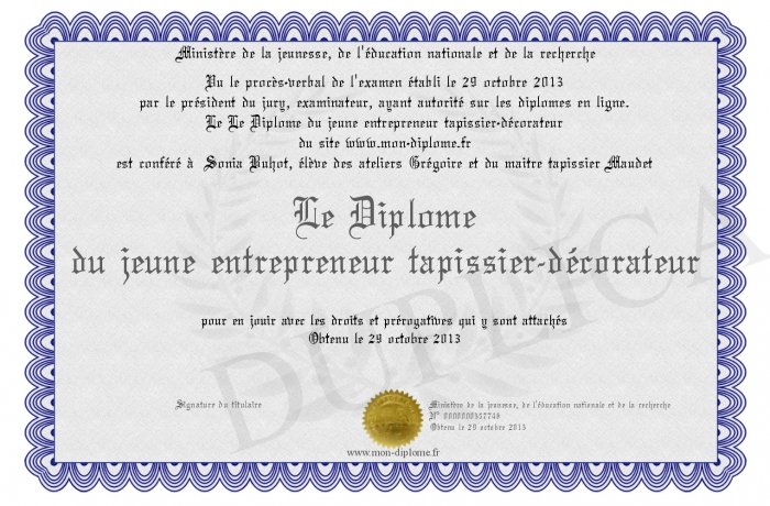 Envoyez par email votre Le Diplôme du jeune entrepreneur tapissier-décorateur personalisé