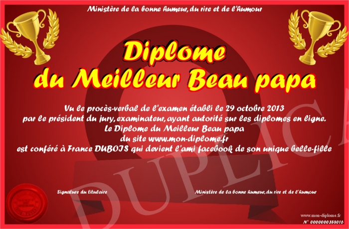 Envoyez par email votre Diplôme du Meilleur Beau papa personalisé