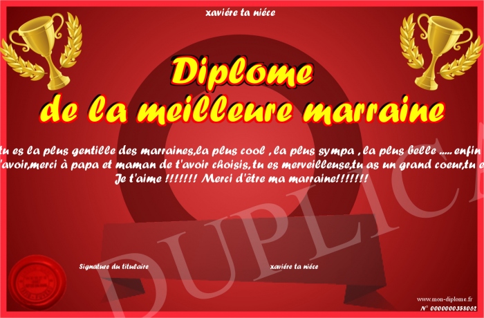 Envoyez par email votre Diplôme de la meilleure marraine personalisé