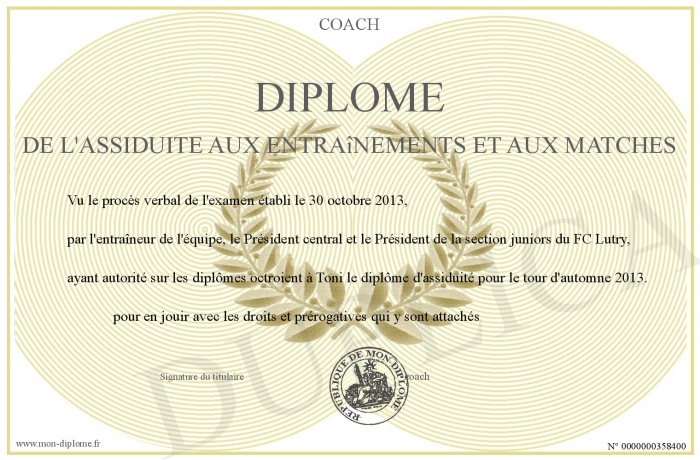 Envoyez par email votre Diplôme de l'assiduité aux entraînements et aux matches personalisé