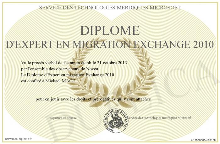 Envoyez par email votre Diplôme d'Expert en migration Exchange 2010 personalisé