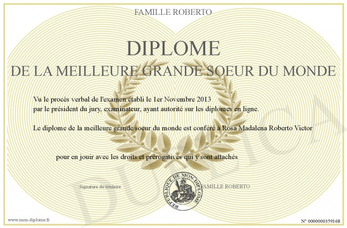 Envoyez par email votre Diplôme de la meilleure grande soeur du monde personalisé