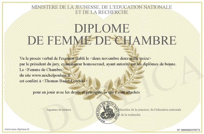 Envoyez par email votre Diplôme de femme de chambre personalisé