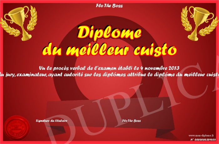 Envoyez par email votre Diplôme du meilleur cuisto personalisé