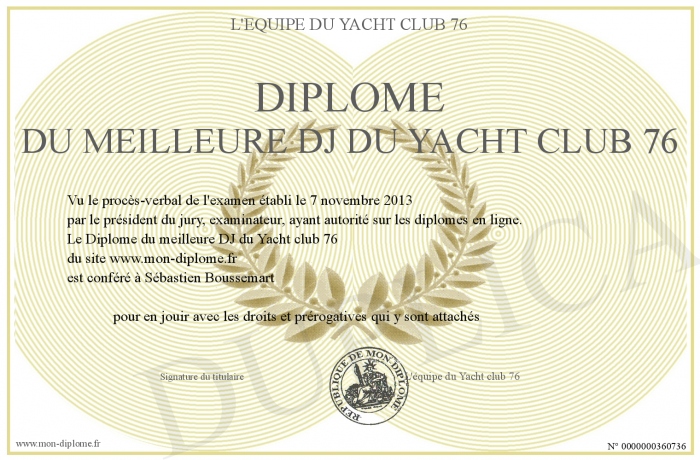 Envoyez par email votre Diplôme du meilleure DJ du Yacht club 76 personalisé