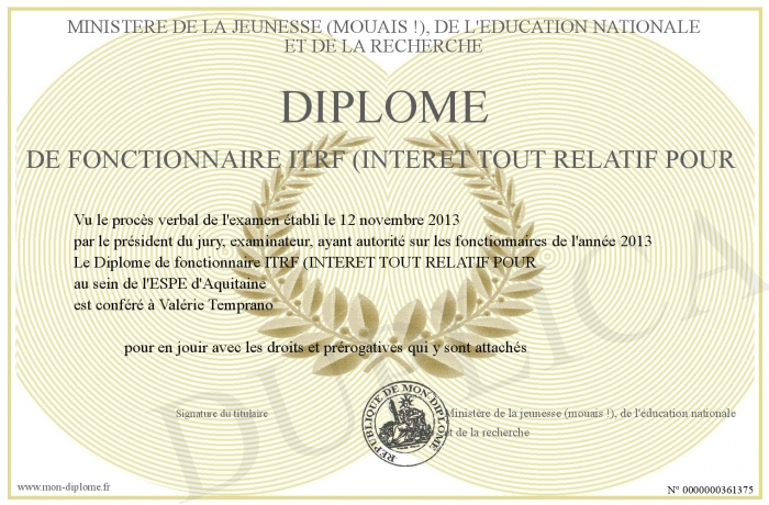 Envoyez par email votre Diplôme de fonctionnaire ITRF (INTERET TOUT RELATIF POUR personalisé