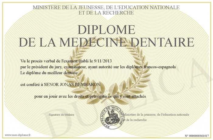 Envoyez par email votre Diplôme de la Médecine Dentaire personalisé