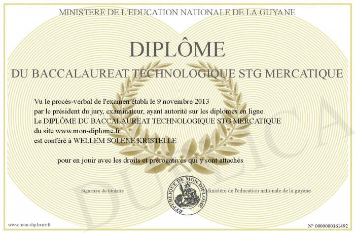 Envoyez par email votre DIPLÔME DU BACCALAUREAT TECHNOLOGIQUE STG MERCATIQUE personalisé