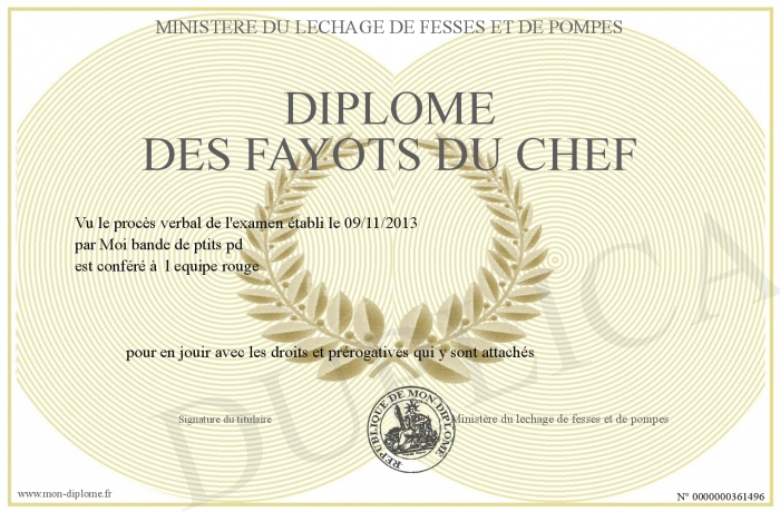 Envoyez par email votre Diplôme des Fayots du chef personalisé