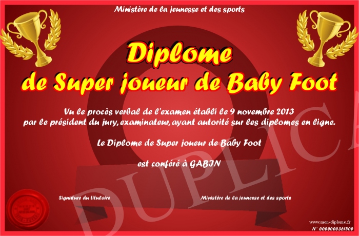 Envoyez par email votre Diplôme de Super joueur de Baby Foot personalisé