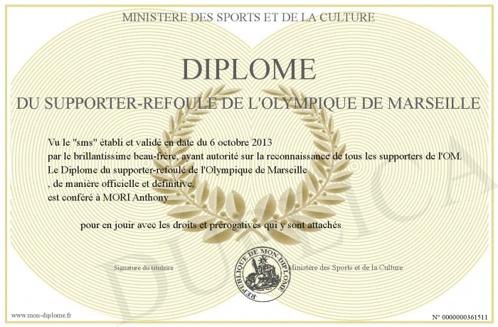 Envoyez par email votre Diplôme du supporter-refoulé de l'Olympique de Marseille personalisé