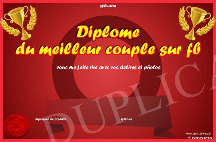 Envoyez par email votre Diplôme du meilleur couple sur fb personalisé