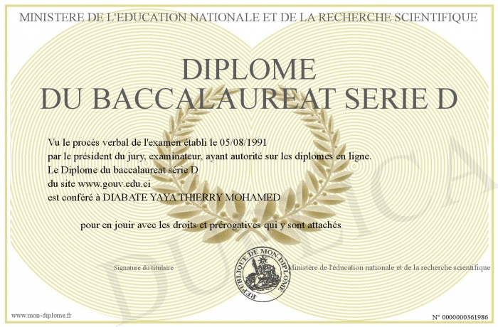 Envoyez par email votre Diplôme du baccalaureat série D personalisé