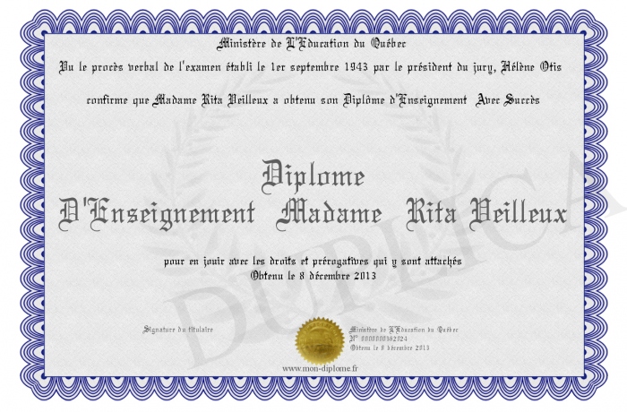 Envoyez par email votre Diplôme D'Enseignement Madame Rita Veilleux personalisé