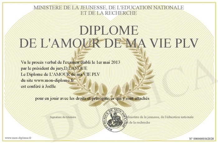 Envoyez par email votre Diplôme de L'AMOUR de ma VIE PLV personalisé
