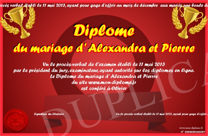 Envoyez par email votre Diplôme du mariage d' Alexandra et Pierrre personalisé