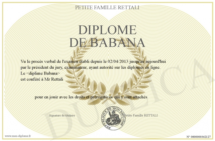 Envoyez par email votre Diplôme de Babana personalisé