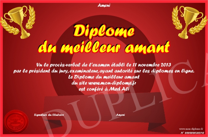 Envoyez par email votre Diplôme du meilleur amant personalisé