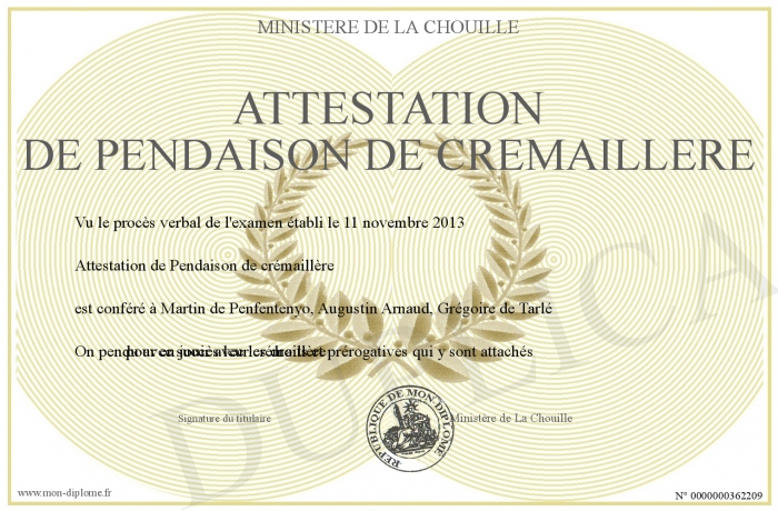 Envoyez par email votre Attestation de Pendaison de crémaillère personalisé