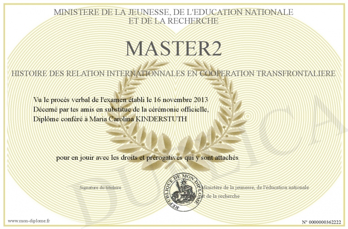 Envoyez par email votre MASTER2 Histoire des Relation Internationnales en Coopération Transfrontalière personalisé