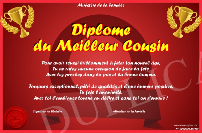 Envoyez par email votre Diplôme du Meilleur Cousin personalisé