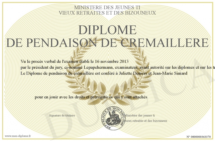 Envoyez par email votre Diplôme de pendaison de crémaillère personalisé