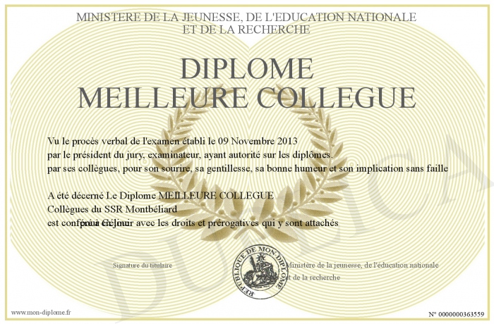 Envoyez par email votre Diplôme MEILLEURE COLLEGUE personalisé