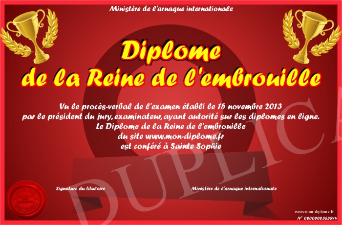 Envoyez par email votre Diplôme de la Reine de l'embrouille personalisé