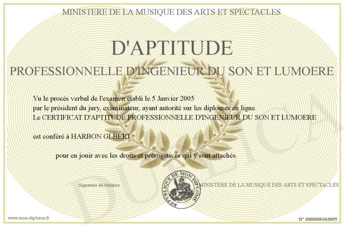 Envoyez par email votre D'APTITUDE PROFESSIONNELLE D'INGENIEUR DU SON ET LUMOERE personalisé