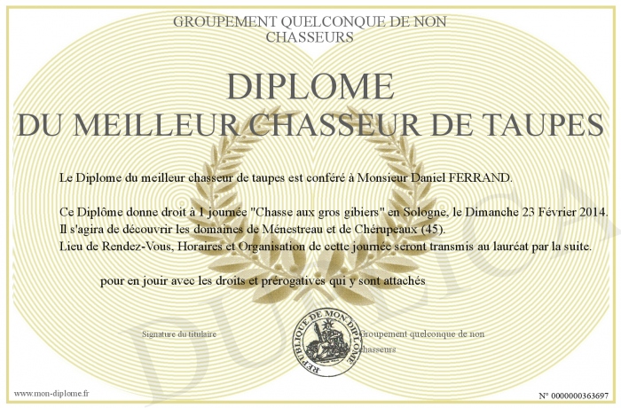 Envoyez par email votre Diplôme du meilleur chasseur de taupes personalisé