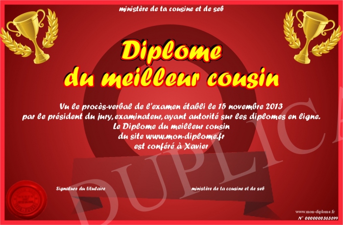 Envoyez par email votre Diplôme du meilleur cousin personalisé