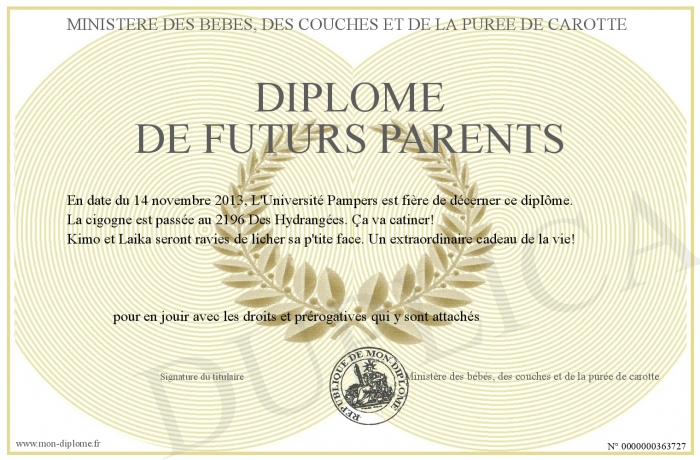 Envoyez par email votre Diplôme de FUTURS PARENTS personalisé