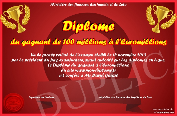 Envoyez par email votre Diplôme du gagnant de 100 millions à l'Euromillions personalisé