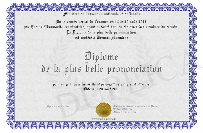 Envoyez par email votre Diplôme de la plus belle prononciation personalisé