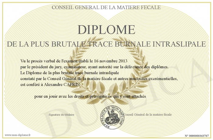 Envoyez par email votre Diplôme de la plus brutale trace burnale intraslipale personalisé
