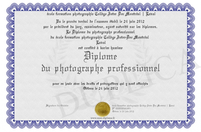 Envoyez par email votre Diplôme du photographe professionnel personalisé