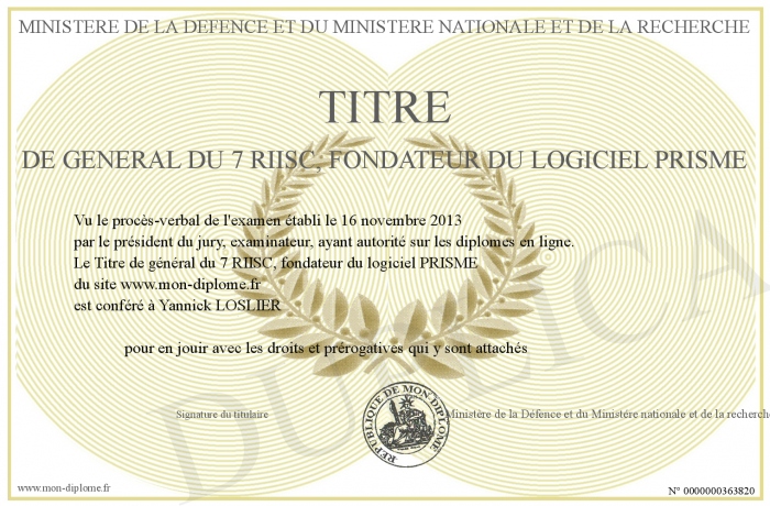 Envoyez par email votre Titre de général du 7 RIISC, fondateur du logiciel PRISME personalisé