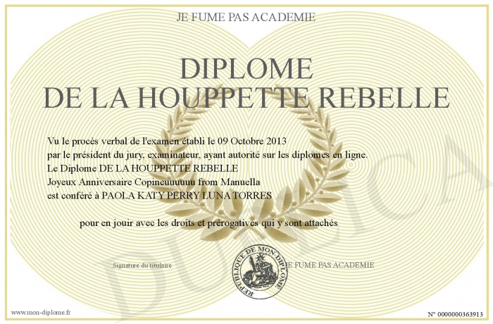 Envoyez par email votre Diplôme DE LA HOUPPETTE REBELLE personalisé