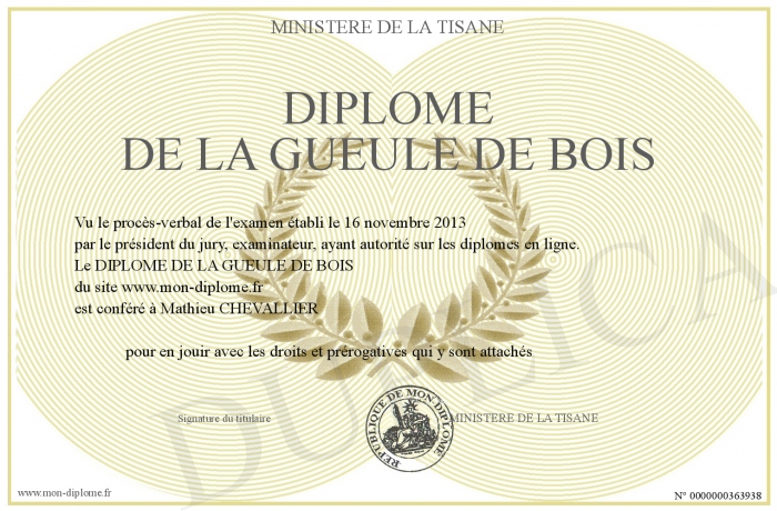 Envoyez par email votre DIPLOME DE LA GUEULE DE BOIS personalisé