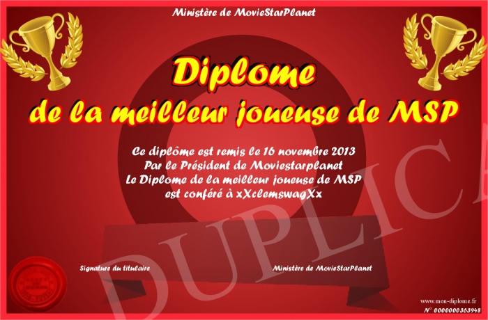 Envoyez par email votre Diplôme de la meilleur joueuse de MSP personalisé