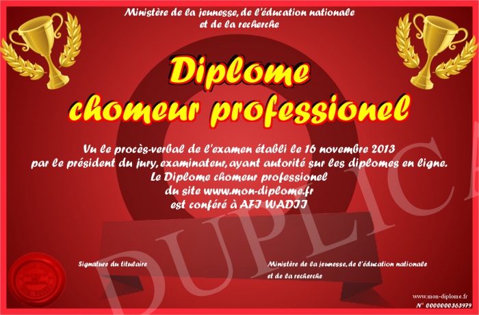 Envoyez par email votre Diplôme chomeur professionel personalisé