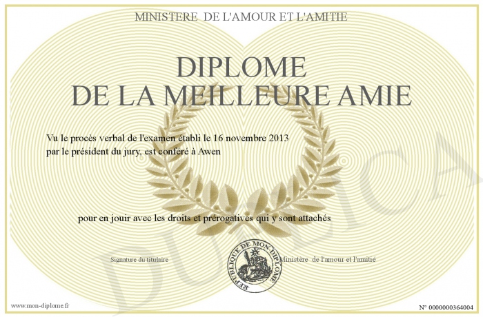 Envoyez par email votre Diplome de la meilleure Amie personalisé